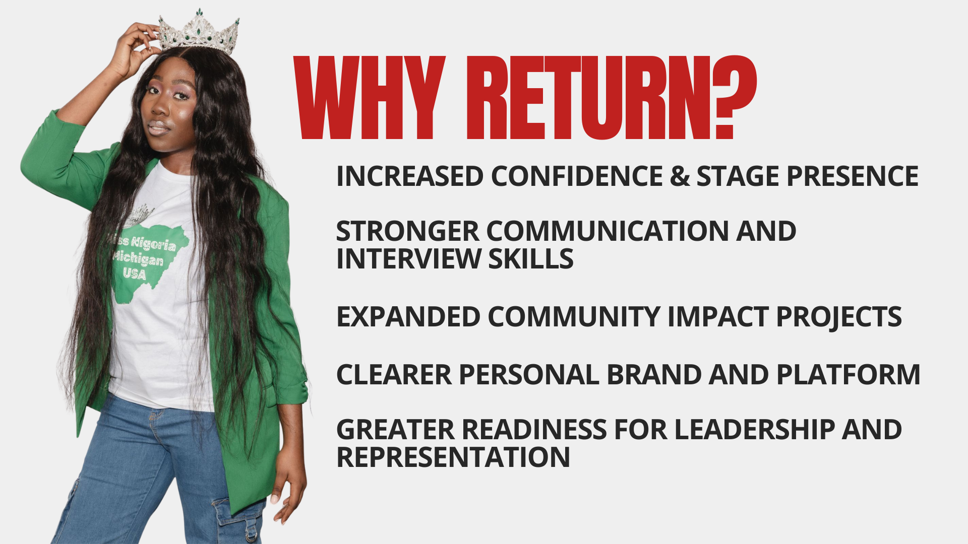 Miss Nigeria Michigan USA recognizes that leadership is a journey. Returning contestants are welcomed and valued for the growth they bring back to the stage.