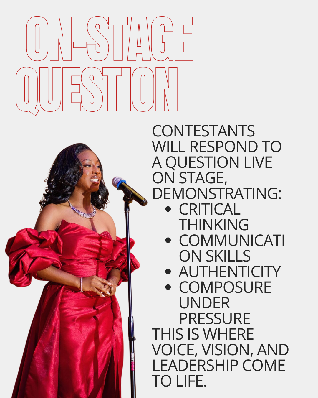 Contestants will participate in a fundraising initiative connected to their Community Impact Project. Funds raised will directly support their selected cause. Reinforces leadership through service, advocacy, and impact.