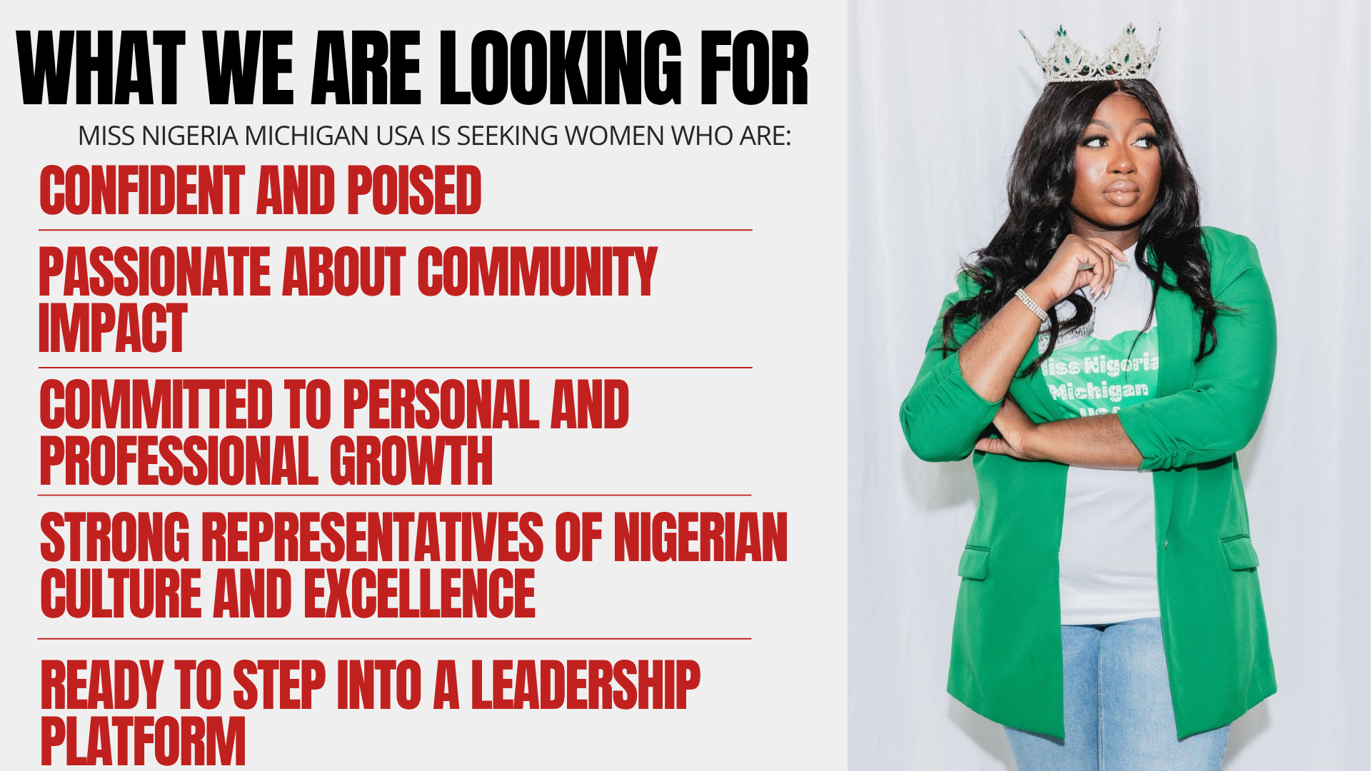 Take the first step toward competing for Miss Nigeria Michigan USA 2026.